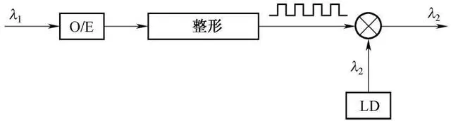 光电型光波长转换器是将波长为λ1的光信号转换成电信号,经过整形后,调制所需波长λ2的半导体激光器(简称LD),输出波长为λ2的光信号,从而实现波长转换,如图所示。光电型光波长转换器技术比较成熟,容易实现,工作稳定。其缺点是装置结构复杂,成本随速率和元件数增加,功耗大,使得它在多波长通道系统中的应用受到限制。