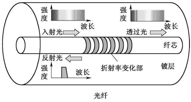 光纤光栅是在光纤的纤芯部分因折射率周期性发生变化而形成的。光纤光栅利用向光纤纤芯照射紫外线时折射率上升的现象制作而成。向光纤光栅内射入光时,只有符合折射率周期变化的波长光会受到影响(反射或向光纤外发射),如图所示。根据这一特性,可以使光纤本身具有滤波功能。